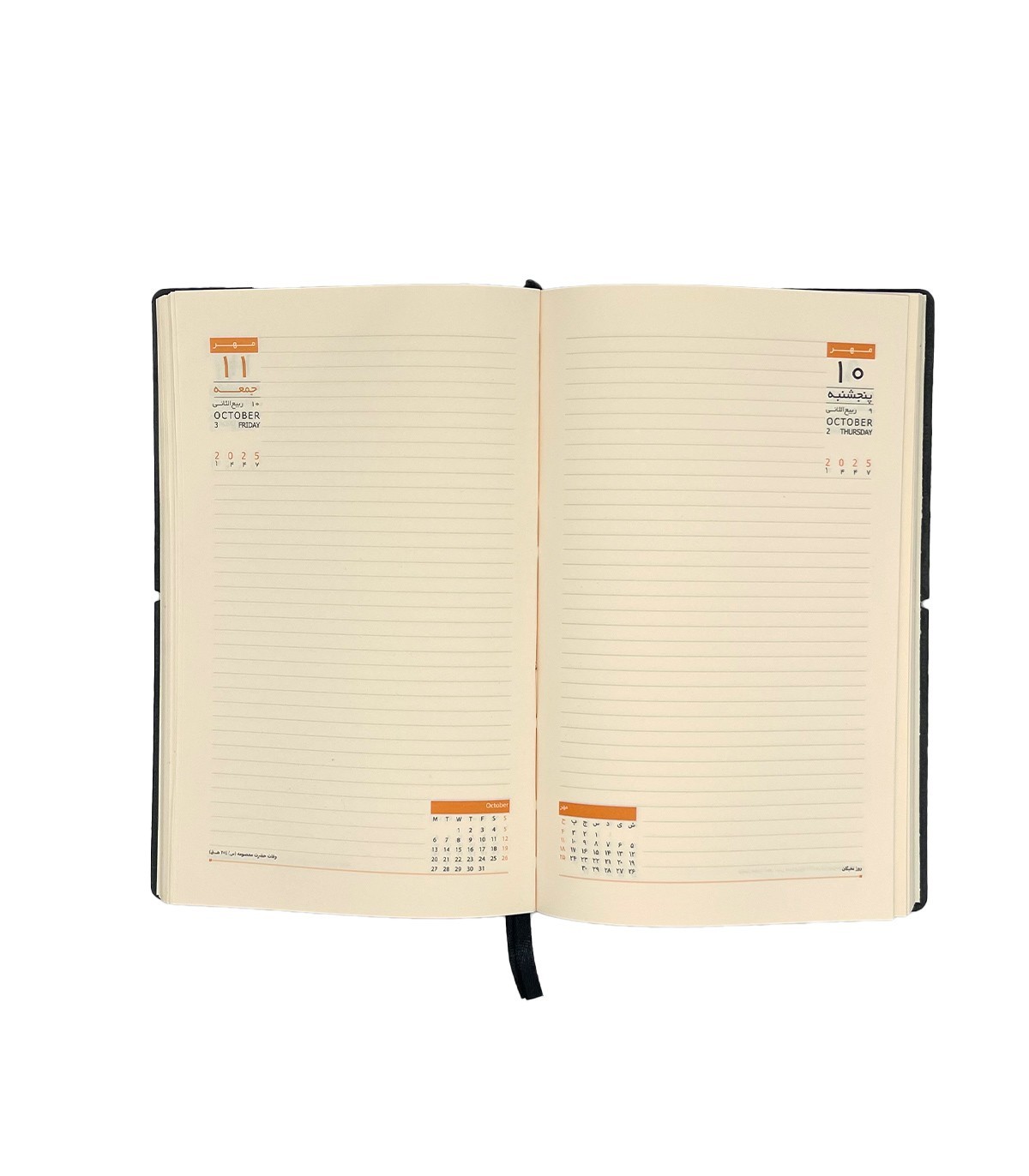 ابعاد: جیبی -  16 × 9 سانتیمتر دارای جلد سخت تقویم 1404 و 1405 در یک نگاه صفحه اهداف ماهیانه، قرار های ماهیانه و کارهای در دست اقدام در هر ماه تقویم کلی هر ماه در دو صفحه روزهای هفته (شنبه- یکشنبه و دوشنبه در یک...