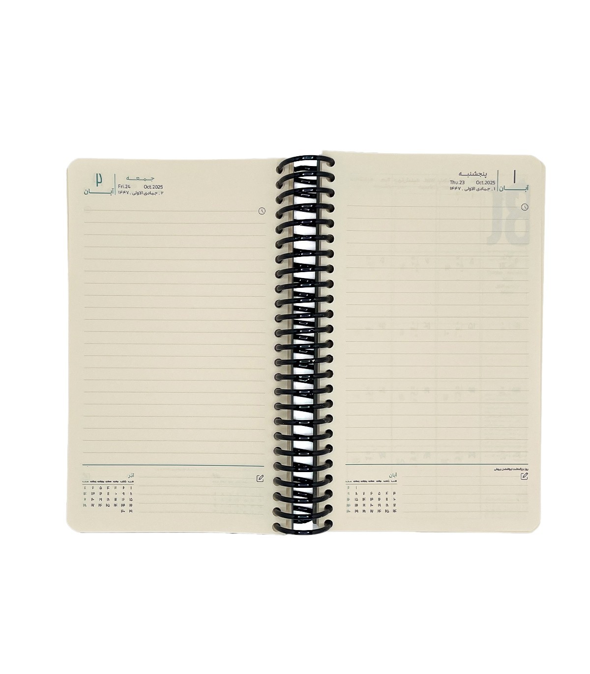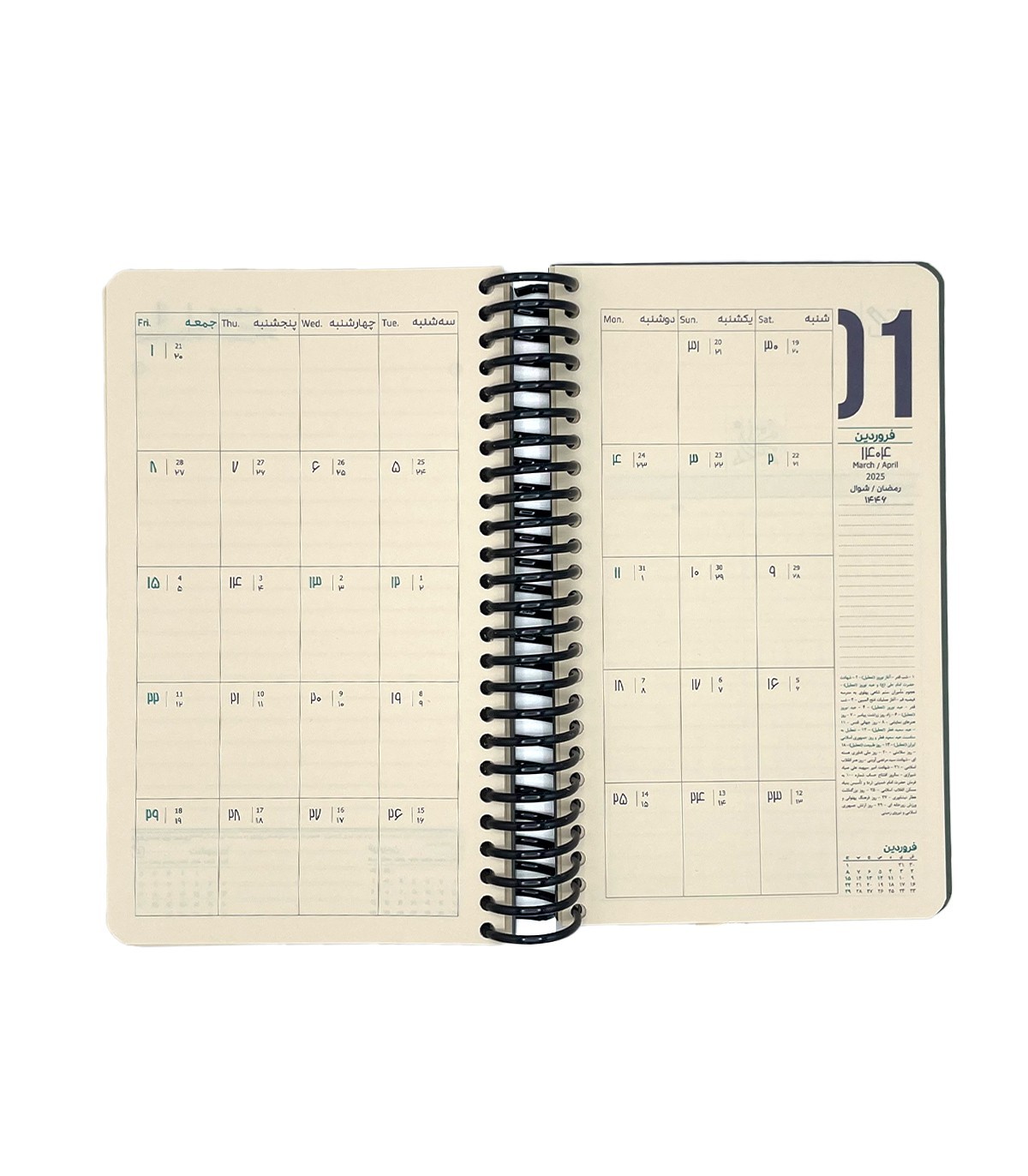 نوع کاغذ : کرم 70 گرم روز شمار جمعه جدا جنس جلد :گالینگور (مقوای سخت) ضمیمه‌ها :دفتر تلفن، یادداشت سایز: نیم وزیری (16×11 سانتیمتر)
