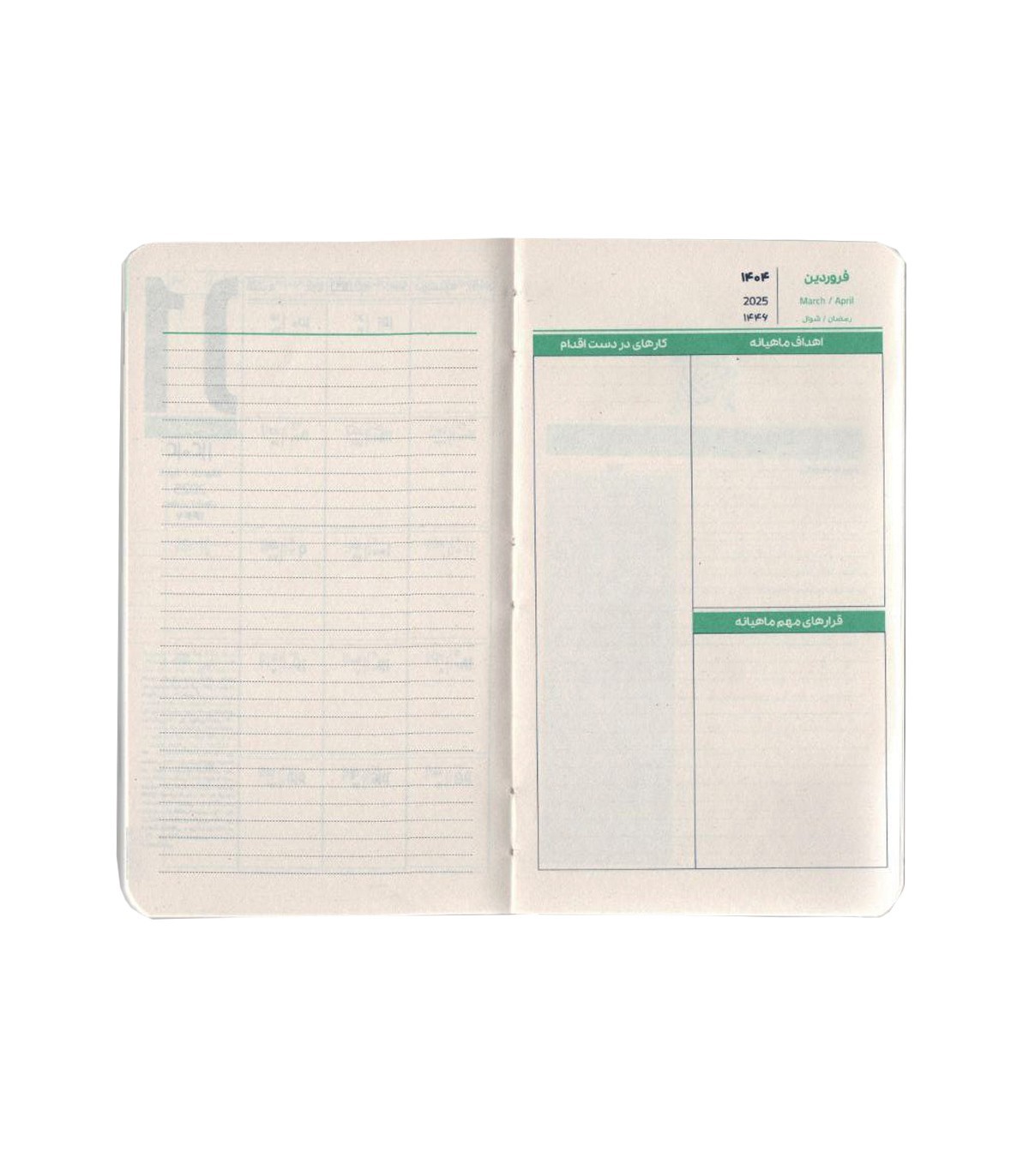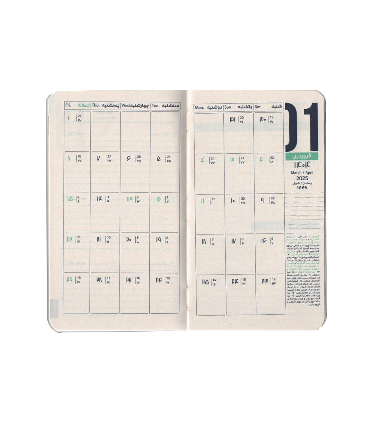 ابعاد: جیبی -  16 × 9 سانتیمتر دارای جلد سخت تقویم 1404 و 1405 در یک نگاه صفحه اهداف ماهیانه، قرار های ماهیانه و کارهای در دست اقدام در هر ماه تقویم کلی هر ماه در دو صفحه روزهای هفته (شنبه- یکشنبه و دوشنبه در یک...