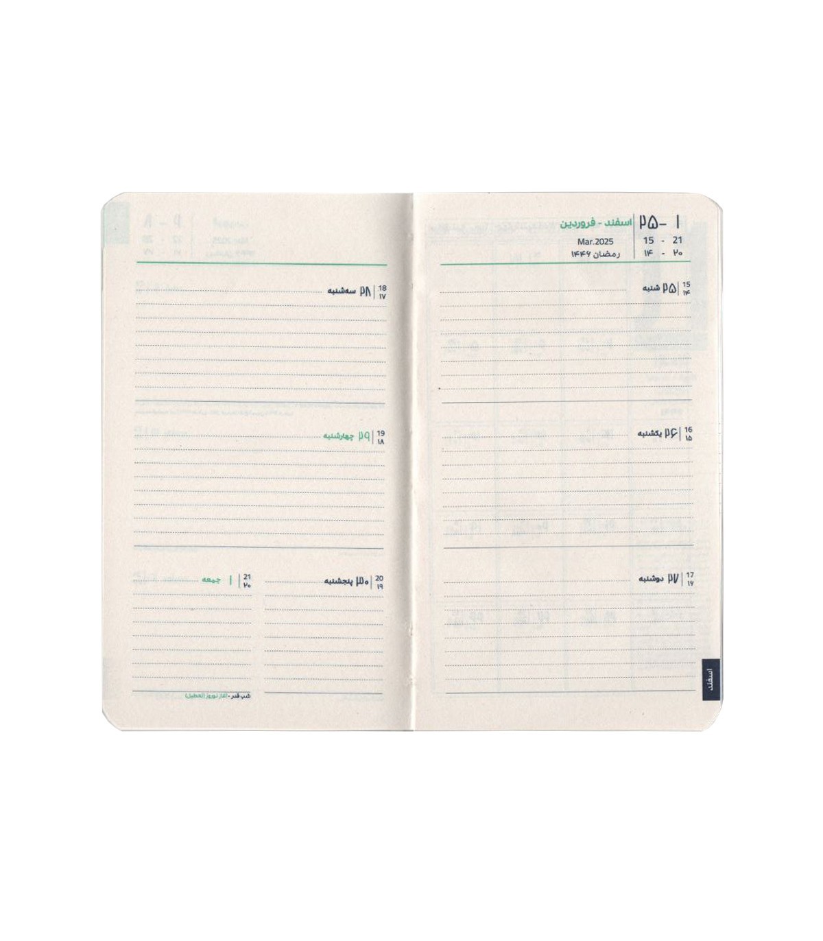 • روزهای هفته (شنبه- یکشنبه و دوشنبه در یک صفحه، سه شنبه و چهارشنبه و پنج شنبه و جمعه در یک صفحه)