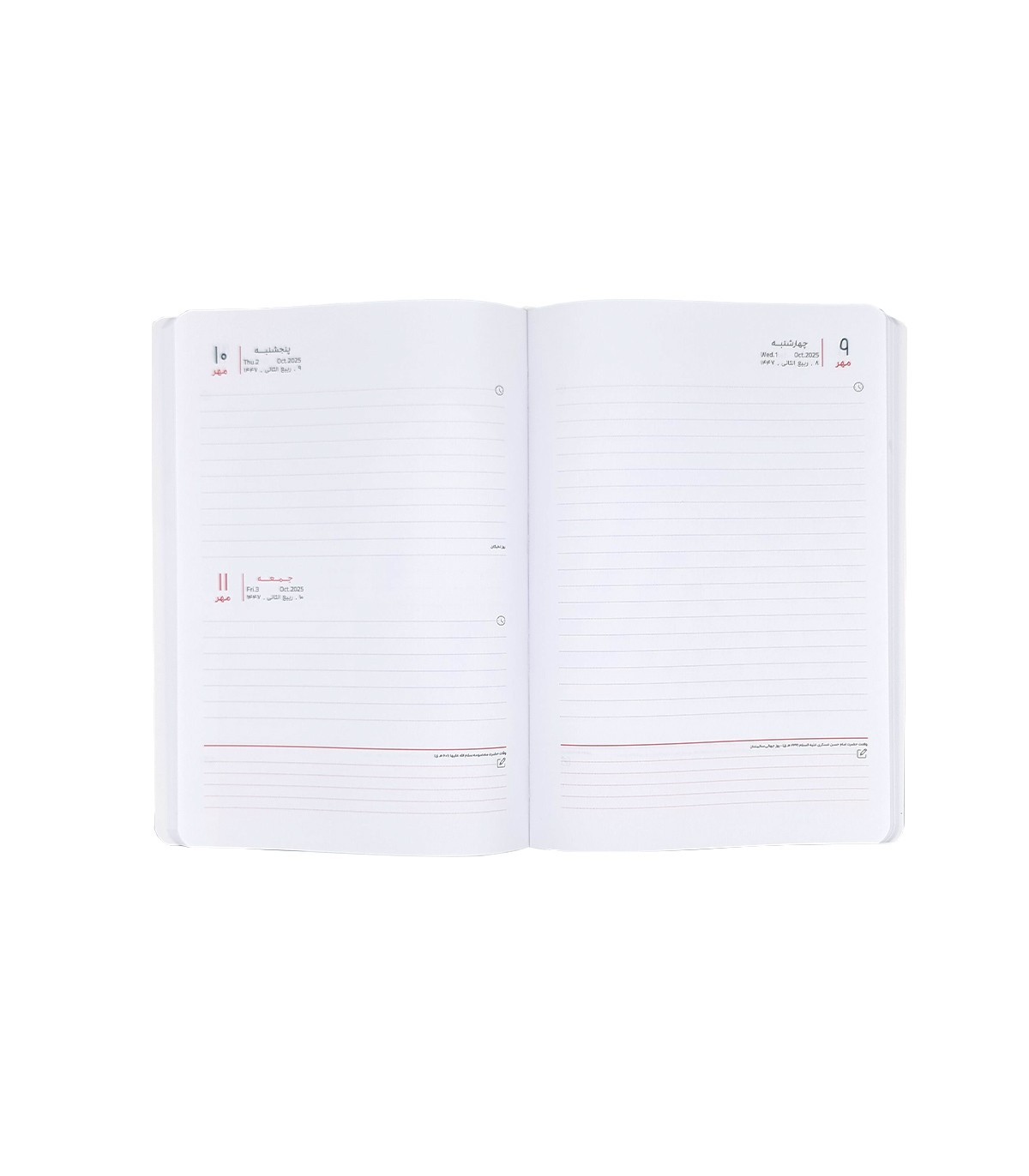 نوع کاغذ : کرم 70 گرم روز شمار جمعه جدا جنس جلد :گالینگور (مقوای سخت) ضمیمه‌ها :دفتر تلفن، یادداشت سایز: نیم وزیری (16×11 سانتیمتر)