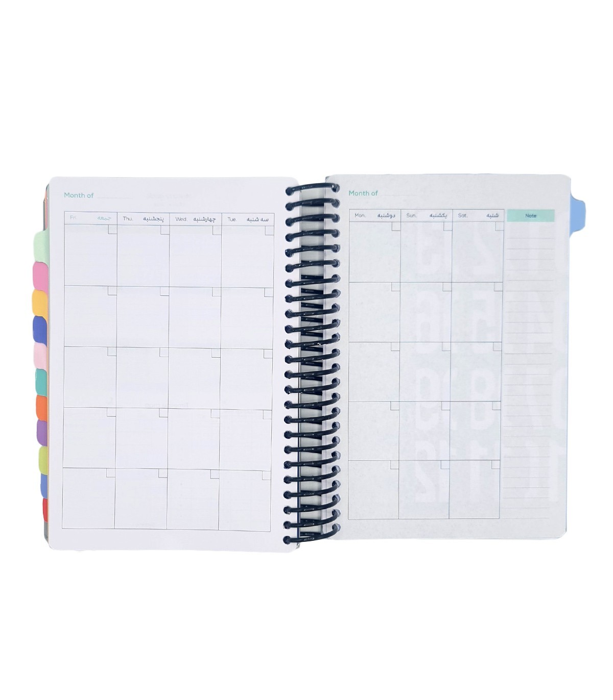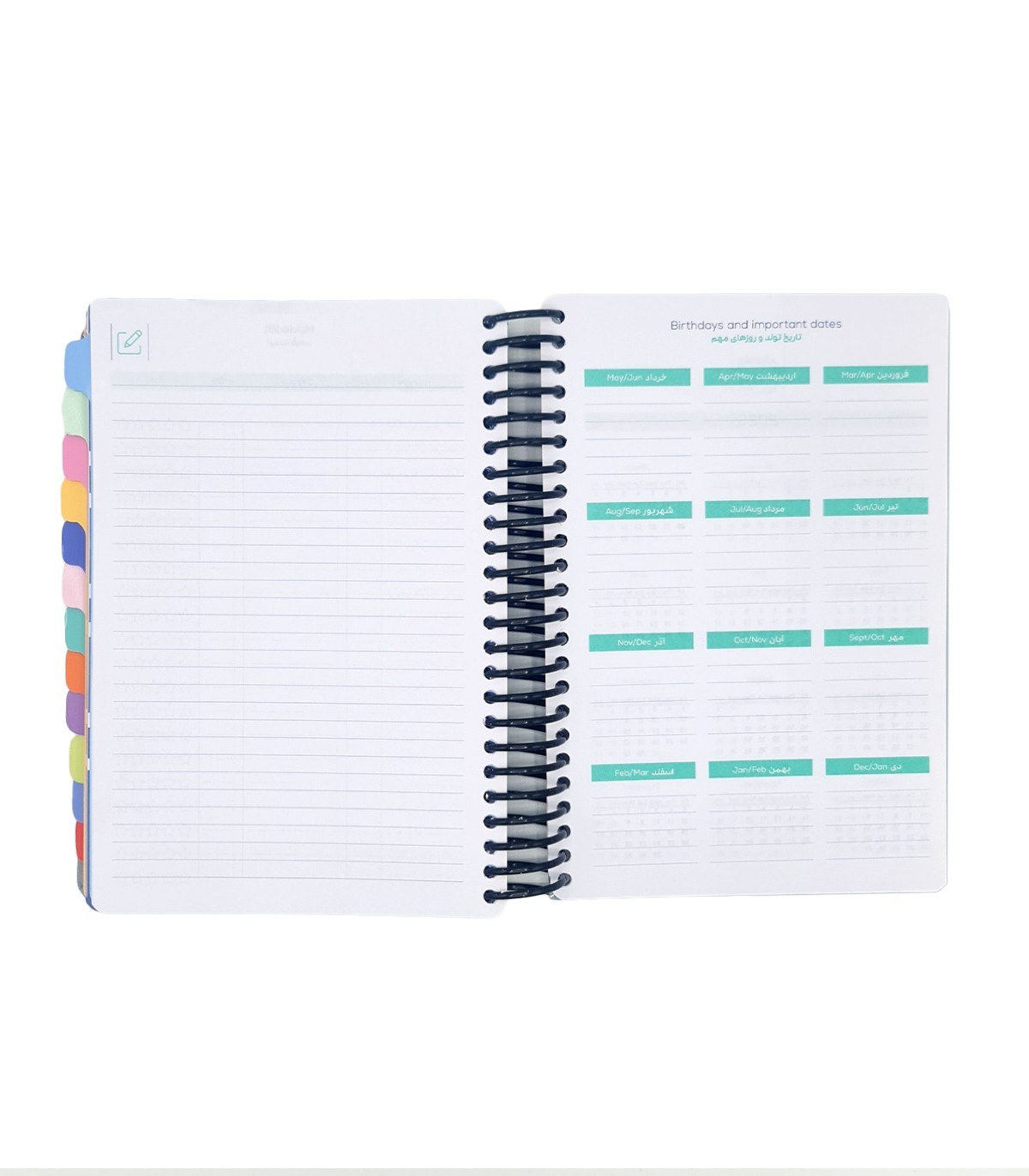 ابعاد: جیبی -  16 × 9 سانتیمتر دارای جلد سخت تقویم 1404 و 1405 در یک نگاه صفحه اهداف ماهیانه، قرار های ماهیانه و کارهای در دست اقدام در هر ماه تقویم کلی هر ماه در دو صفحه روزهای هفته (شنبه- یکشنبه و دوشنبه در یک...