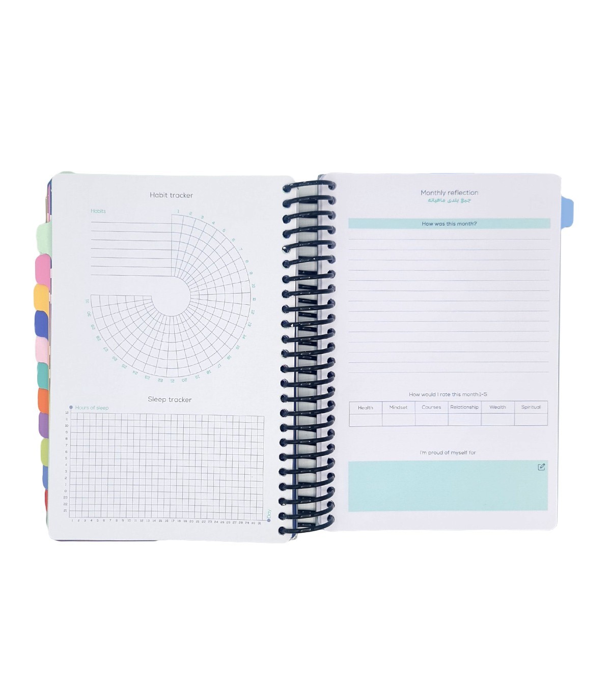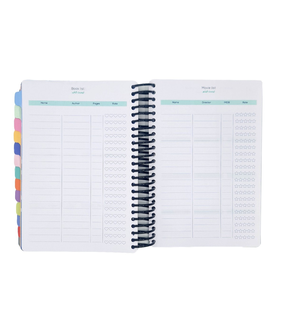 ابعاد: A5 (20 × 14.5 سانتیمتر) تعداد برگ: 60 برگ نوع صحافی: سیمی فنری دوبل نوع کاغذ: تحریر 80 گرم صفحه رو مربوط به time boxing  و صفحه پشت مربوط به یادداشت
