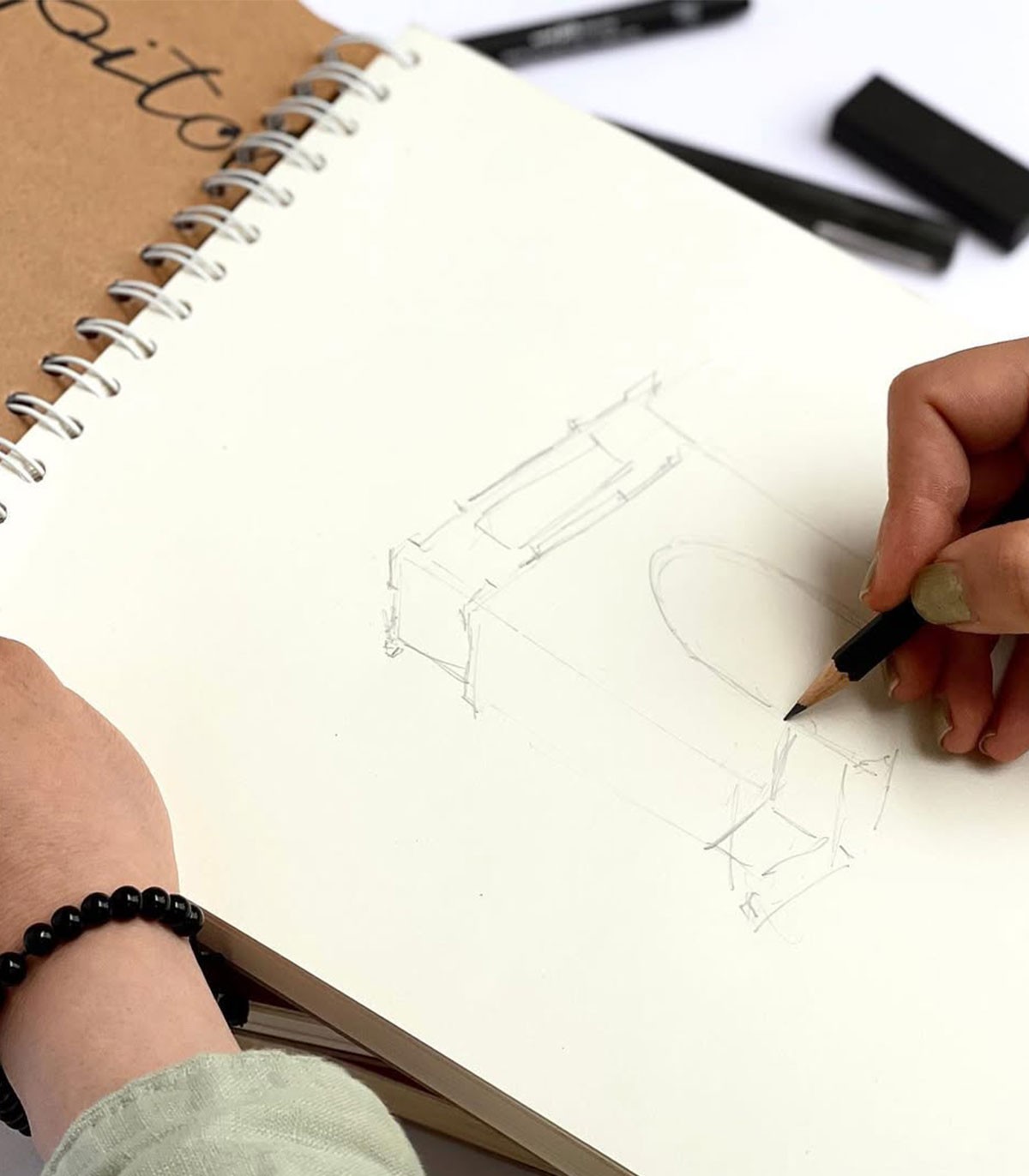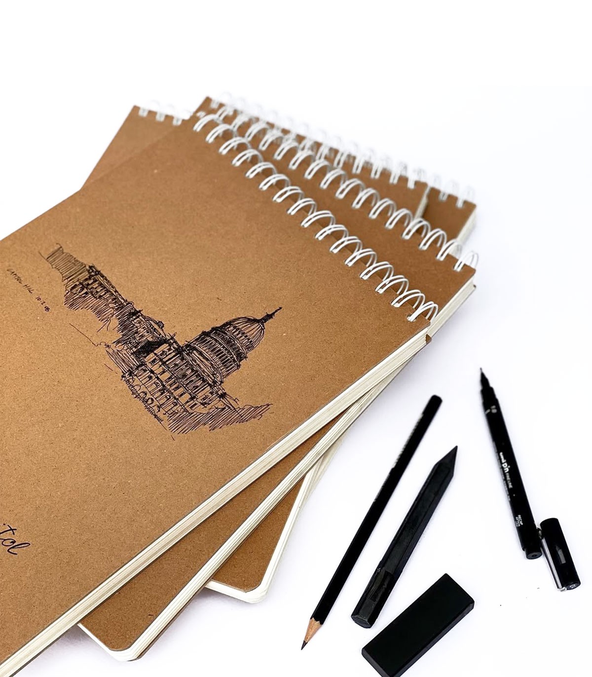 جلد سخت این دفتر اسکیس علاوه بر محافظت از صفحات، ظاهر شیک و مقاومی دارد که برای استفاده روزمره و حمل در کیف یا کولهپشتی بسیار مناسب است و صحافی سیمی آن باعث میشود ورق زدن صفحات آسان باشد و دفتر بهراحتی روی میز باز بماند، بدون نیاز به نگهداشتن آن. کاغذهای داخلی از نوع بالک بیخط ۷۰ گرم هستند؛ یعنی سطحی صاف و بدون خطوط مزاحم، با بافتی مناسب برای طراحی با مداد، راپید، خودکار یا مارکر. کاغذ بالک بهدلیل وزن سبک و رنگ طبیعی، تجربهای راحت و چشمنواز در طراحی فراهم میکند و از خستگی چشم جلوگیری میکند. این دفتر با ترکیب طراحی کاربردی و کیفیت بالا، نیازهای تخصصی طراحان را بهخوبی پاسخ میدهد.