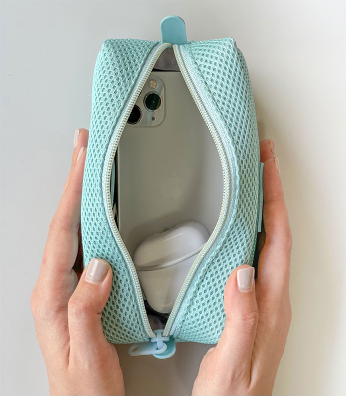 جنس اصلی کیف پارچه مش است که یک لایه ظریف ابری هم به آن متصل شده است، توسط یک زیپ باز و بسته می شود و بسیار مناسب برای قرار دادن کلید، پاوربانک، شارژر، کابل، لوازم آرایش، لوازم التحریر، فلش، ایرفون، دارو و ... می باشد. ضخامت مناسب این کیف و لایه ابری موجود، اثر ضربه های وارده بر اقلام درونش را بر اثر تکان های کیف یا وزن سایر وسایل تا حد مطلوبی خنثی می کند. درزها و محل های اتصال اجزای این کیف بادوام؛ بسیار با مهارت، ظرافت و دقت دوخته و بهم متصل شده اند.