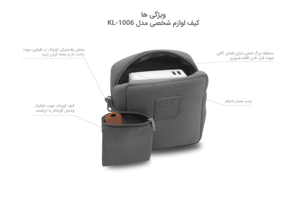 کیف لوازم شخصی و جانبی برند KULE مدل KL-1006 از مواد با کیفیت بالا و مرغوب ساخته شده و دارای طراحی مدرن و بسیار کاربردی است. این کیف دارای یک محفظه اصلی و بزرگ است. بسیار سبک و پرکاربرد است و حجم کمی را اشغال می کند. با قراردادن وسایل مهم و ضروری درون KL-1006می توانید به راحتی آنها را درون کیف پیدا کرده، از میان انبوه وسایل تفکیکشان کنید و در جایی امن قرار دهید. یک کیف کوچک نیز بصورت جداگانه درون آن قرار دارد، از این کیف کوچک می توانید برای قراردادن جواهر، فلش و اقلام کوچک تری استفاده کنید که می خواهید مجزا از سایر اقلام باشد.