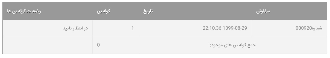- در انتظار تایید: هنگامی که سفارشی را ثبت میکنید، تعداد کوله بن هایی که میتوانید دریافت نمایید نمایش داده می شود. اما تا زمانی که وضعیت سفارش شما به "به دست مشتری رسیده" تغییر نکند، کوله بن های شما در وضعیت "در انتظار تایید" قرار میگیرد.