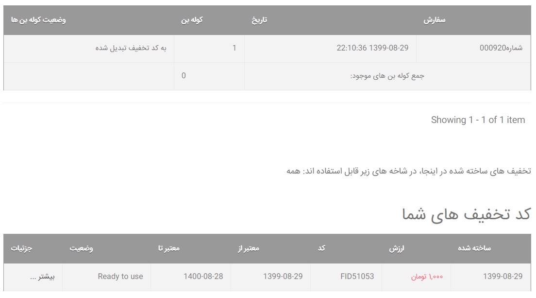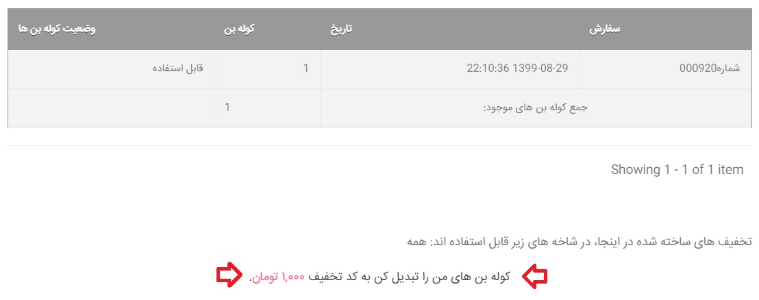 - به کد تخفیف تبدیل شده: کلیه کوله بن هایی که به کد تخفیف تبدیل شده باشند در این قسمت نمایش داده میشود و شما می توانید در سفارشات بعدی خود استفاده کنید.